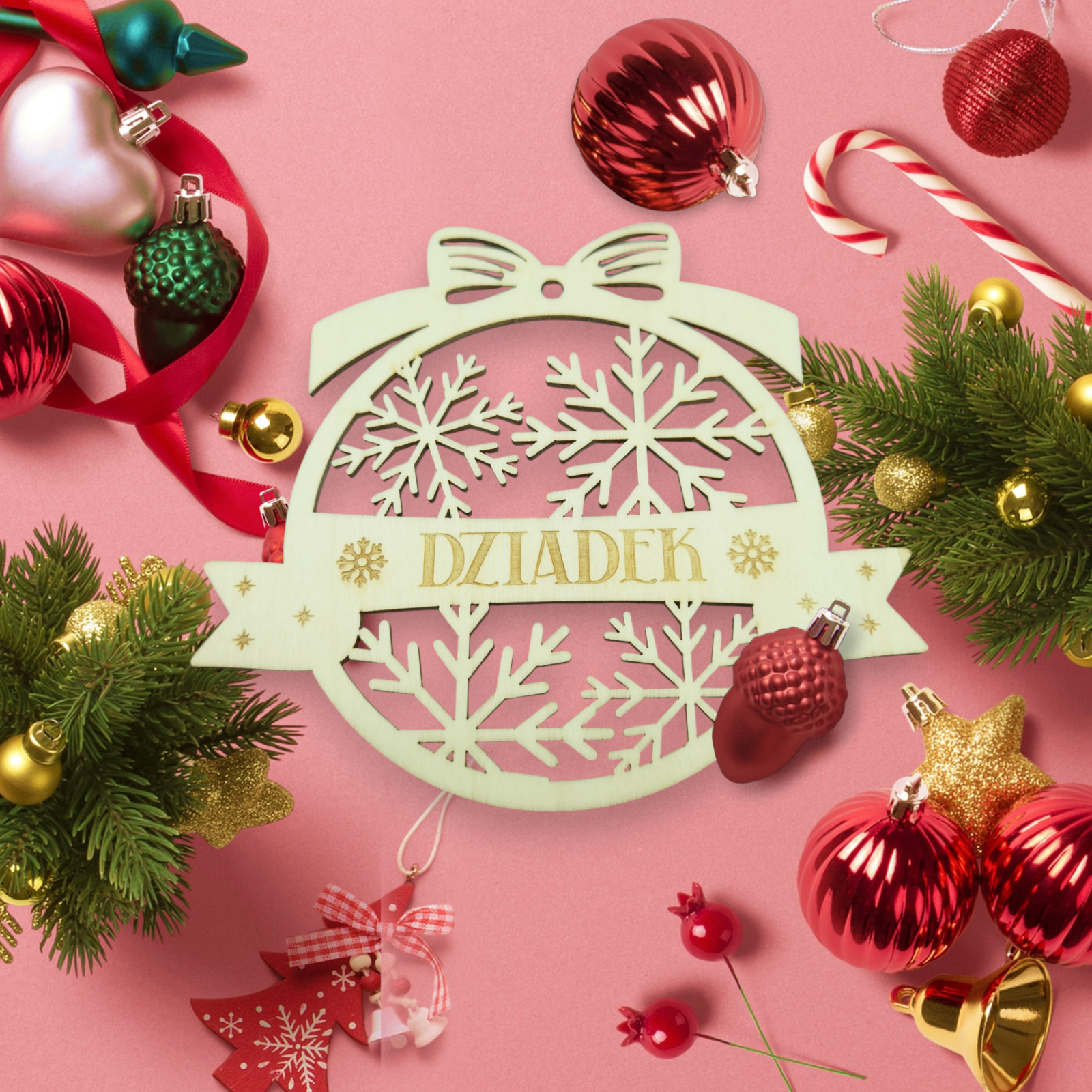 Urocza bombka choinkowa wykonana z naturalnej sklejki, z delikatnie wygrawerowanym imieniem wybranym przez Ciebie. To wyjątkowa, personalizowana ozdoba, która nada każdej choince indywidualnego charakteru i stanie się piękną pamiątką na lata.