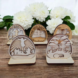 Każdy wzór to osobna historia opowiedziana za pomocą kilku warstw drewna, które tworzą efekt 3D. Idealna dekoracja na Wielkanoc – zarówno do postawienia na stole, komodzie czy parapecie, jak i jako duchowy akcent w domu.