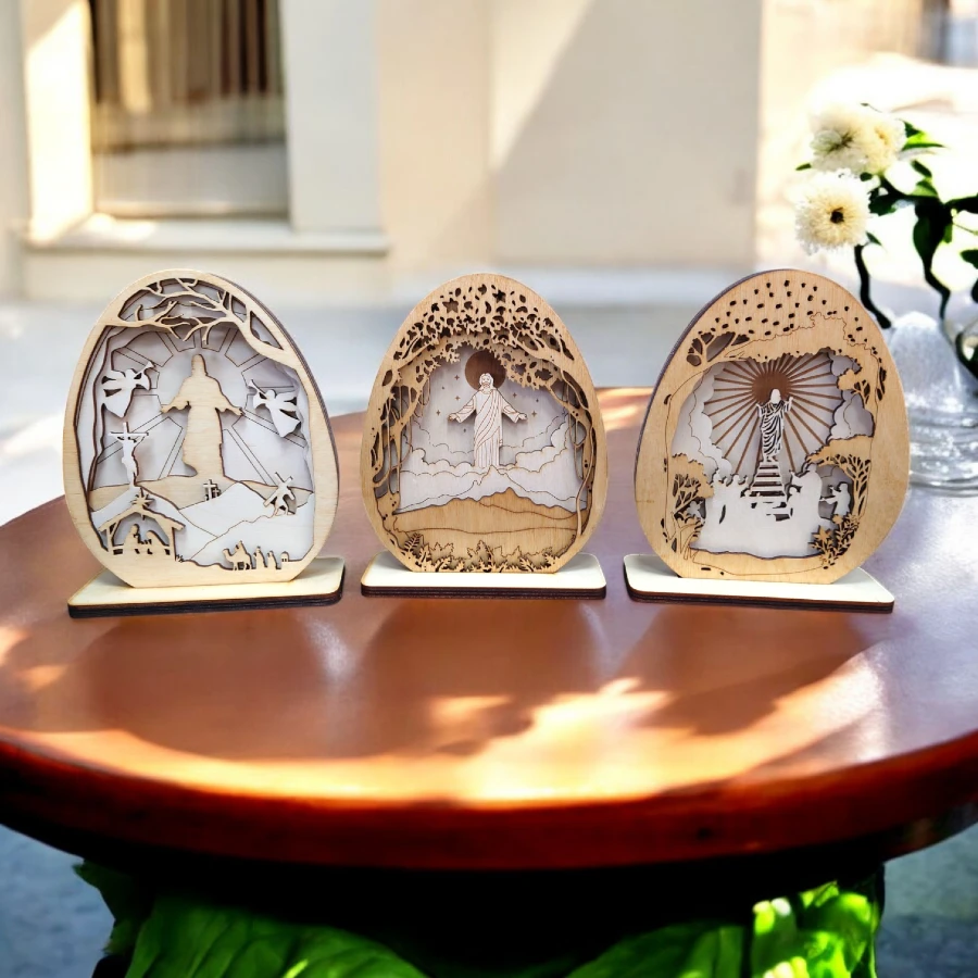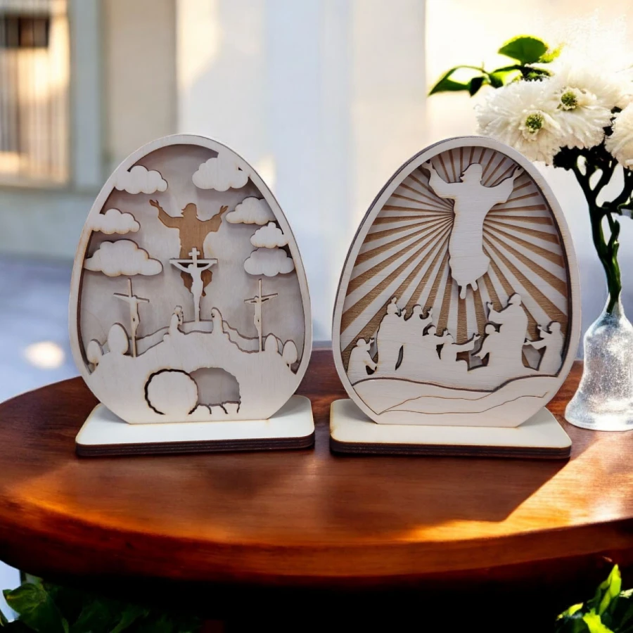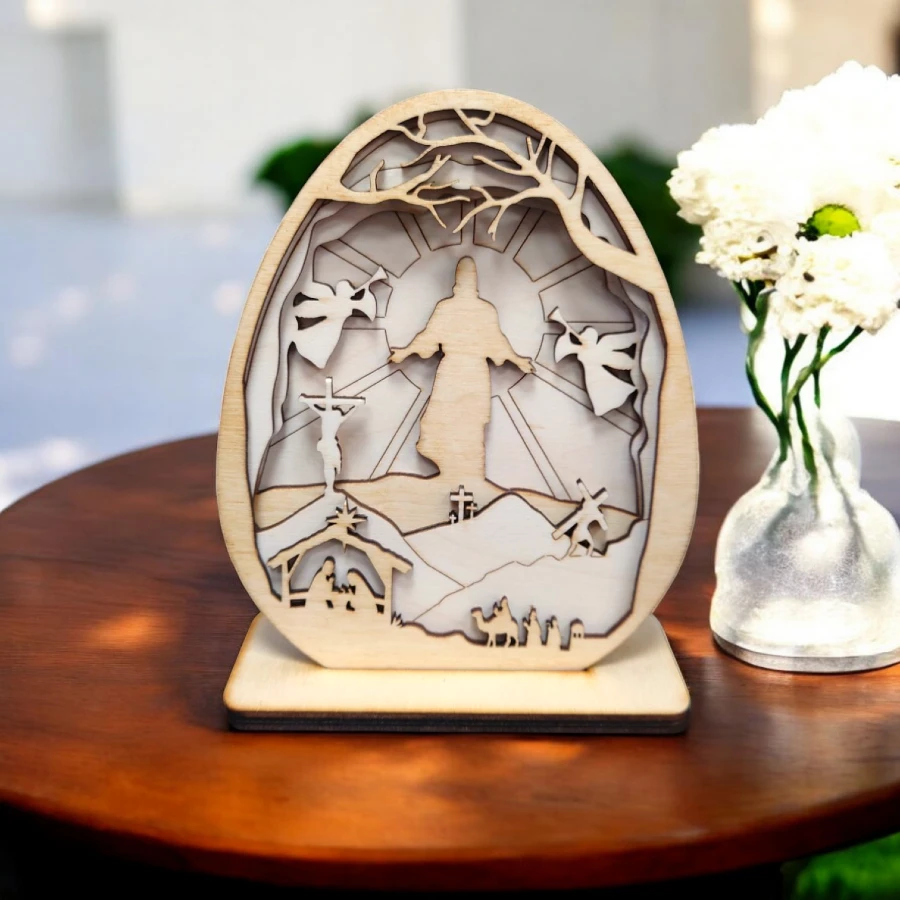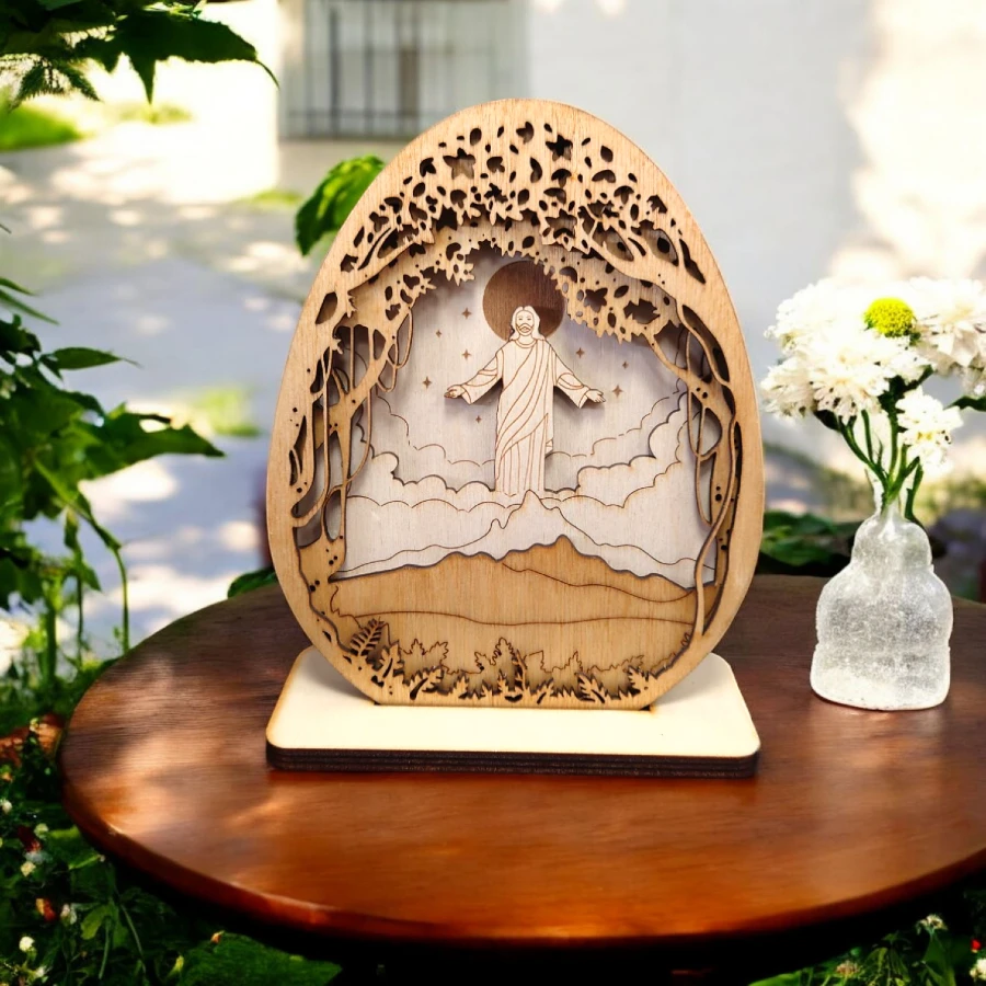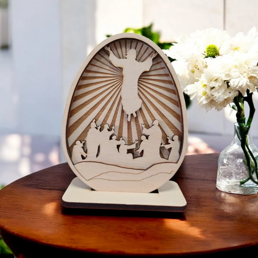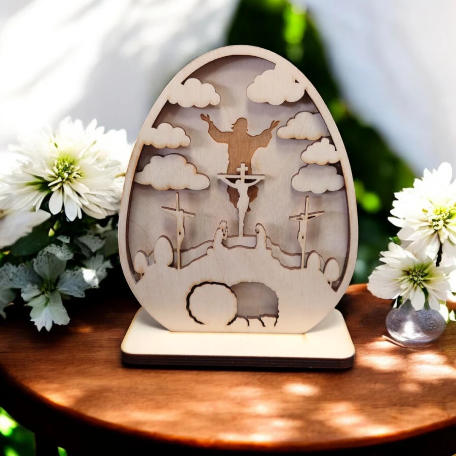 Piękna, warstwowa dekoracja wielkanocna w kształcie jajka, wykonana z precyzją z naturalnej sklejki. Przedstawia sceny związane z męką, śmiercią i zmartwychwstaniem Jezusa Chrystusa – w symbolicznej, wielowymiarowej formie.