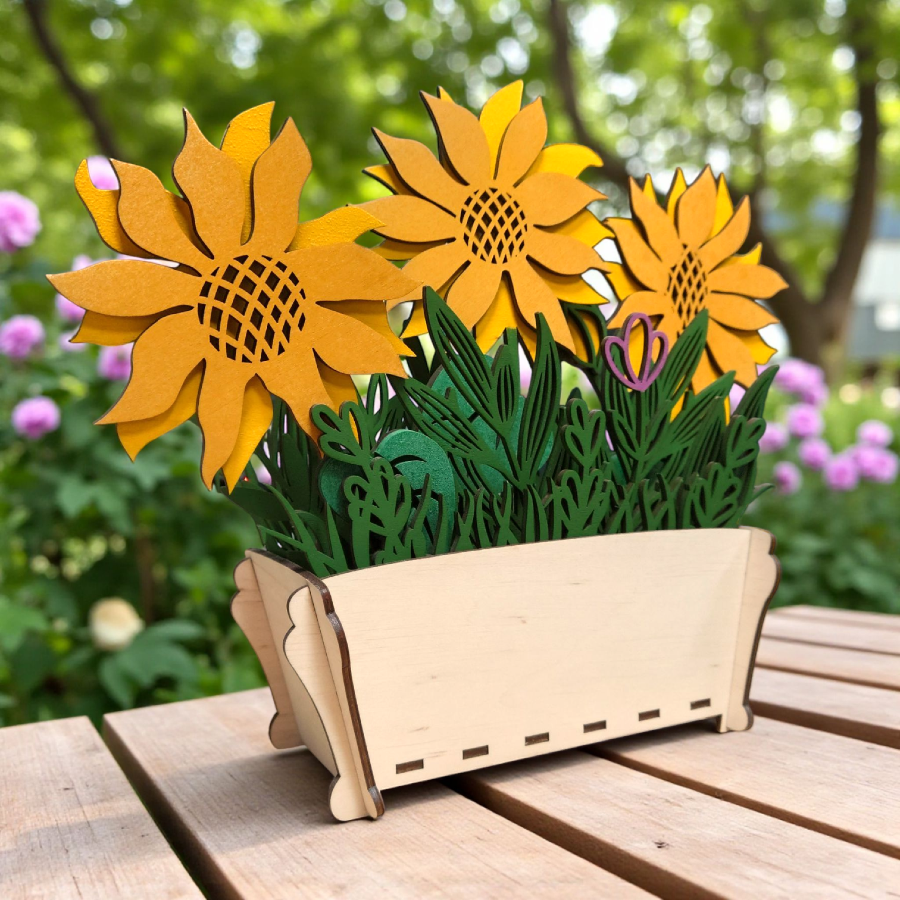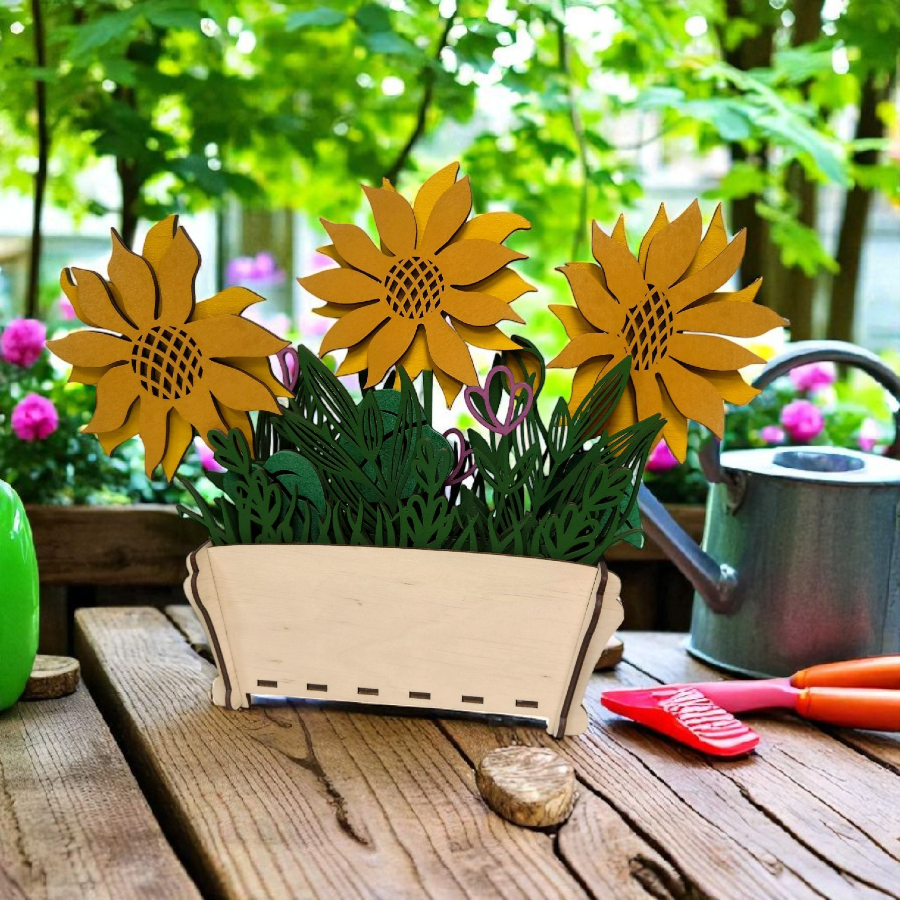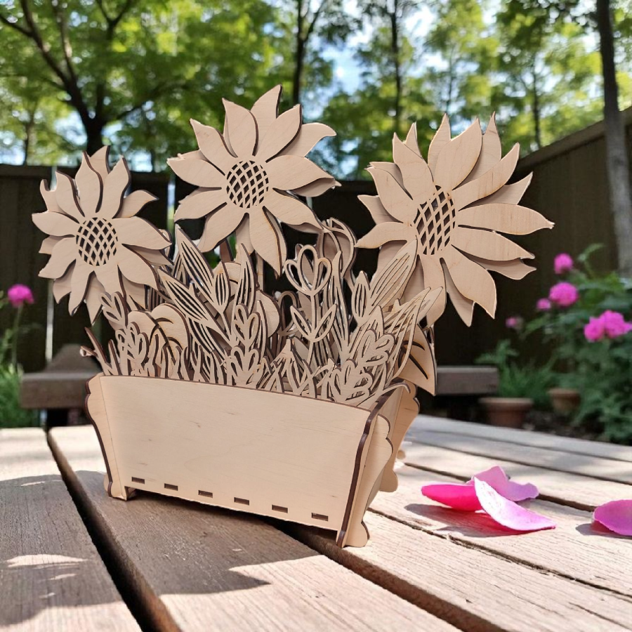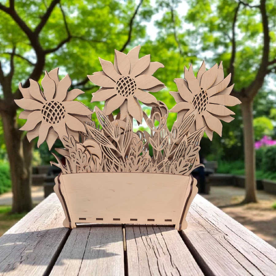 Doniczka ze słonecznikami ze sklejki 3 mm – dekoracja DIY lub gotowa ozdoba. Możliwość malowania, składania i personalizacji grawerem.