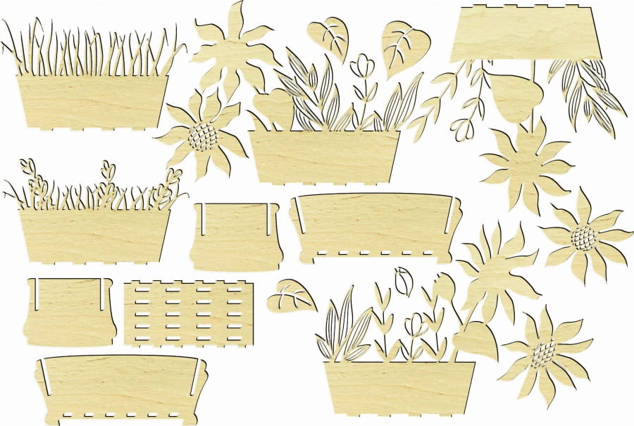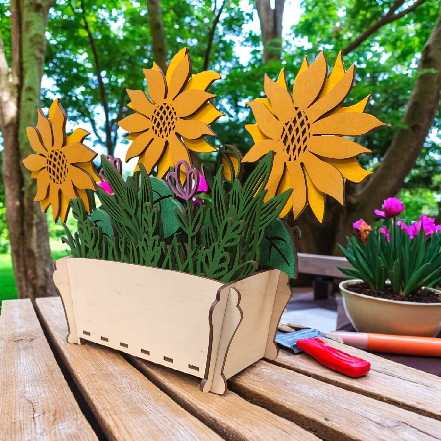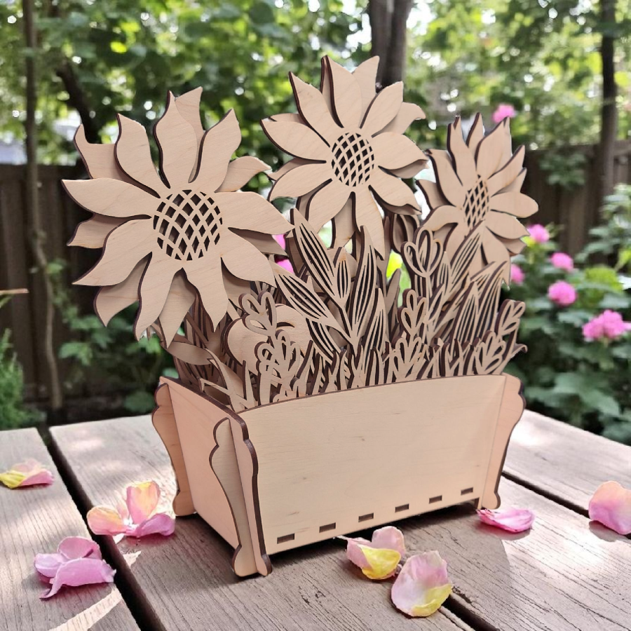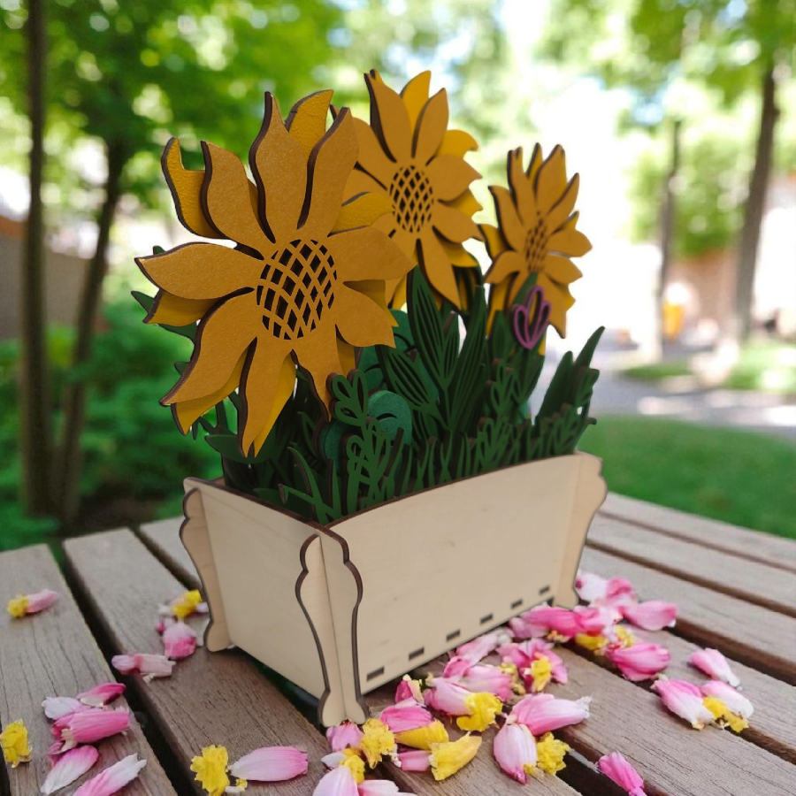 Doniczka ze słonecznikami ze sklejki 3 mm – dekoracja DIY lub gotowa ozdoba. Możliwość malowania, składania i personalizacji grawerem.