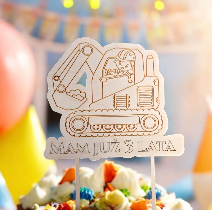 Ten uroczy topper to idealna ozdoba dla każdego małego fana koparek! Wykonany z wysokiej jakości sklejki o grubości 3 mm, precyzyjnie wycięty laserowo i ozdobiony grawerem. Dostępny w dwóch wersjach: