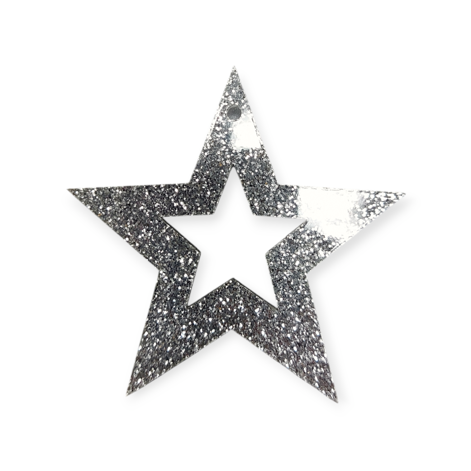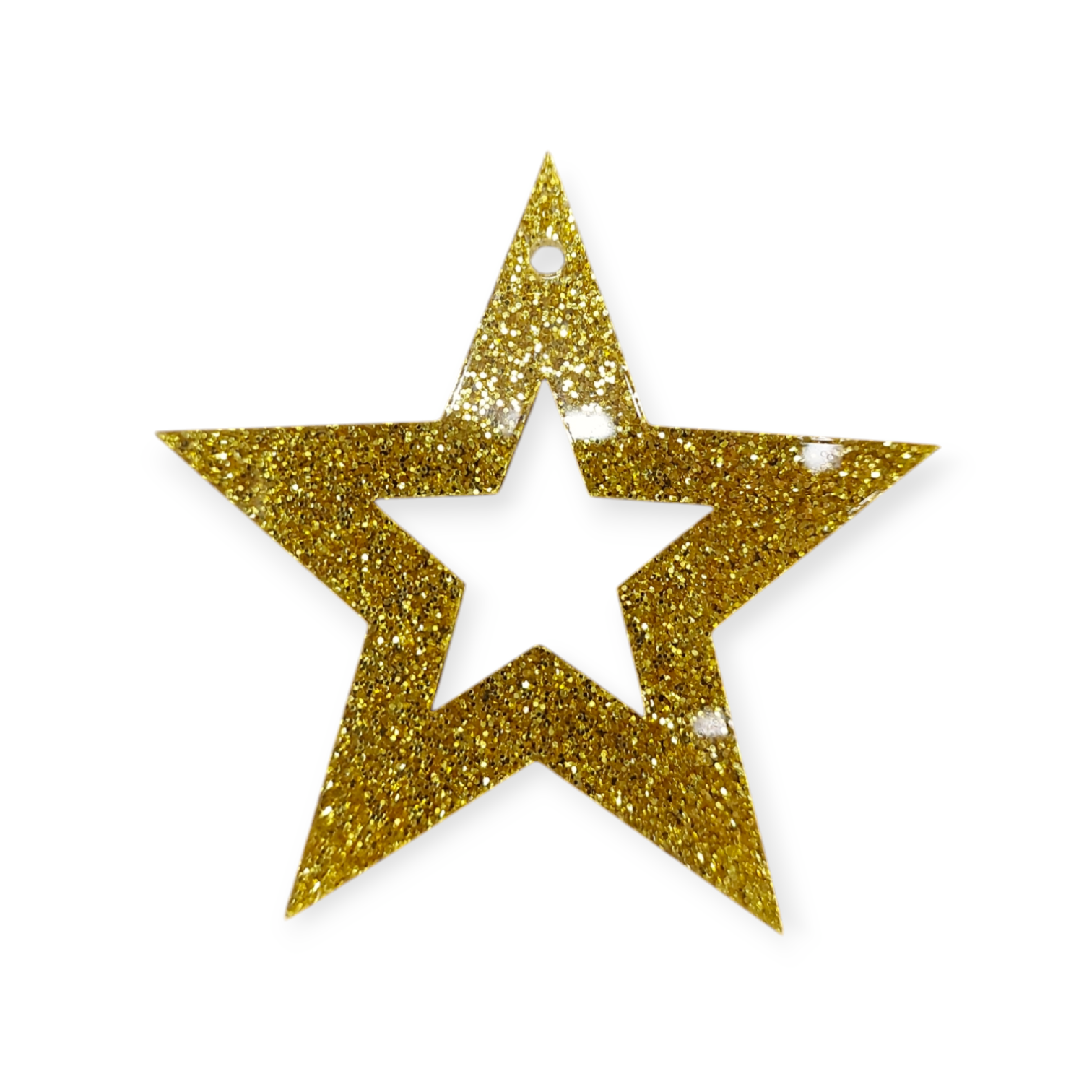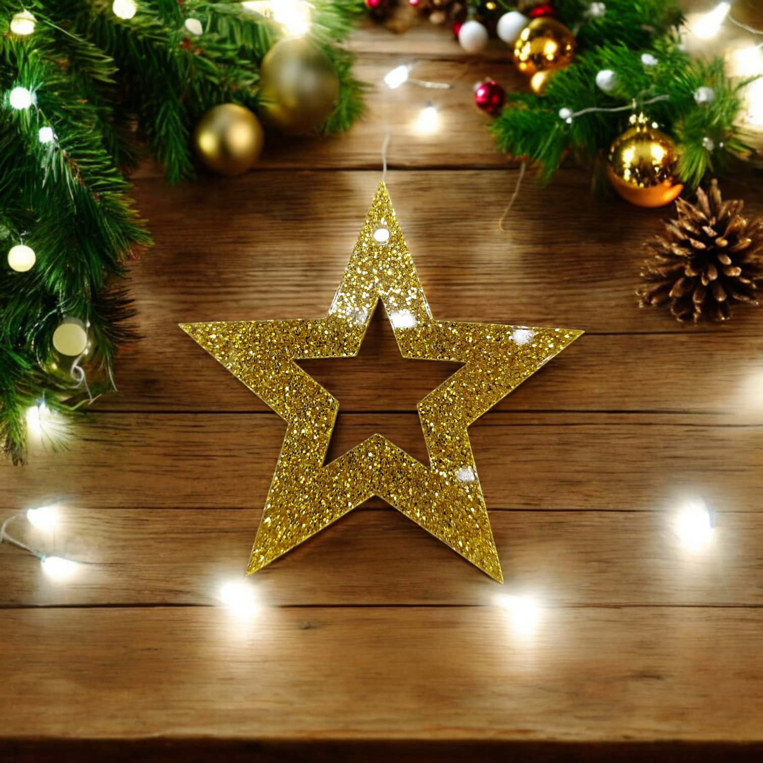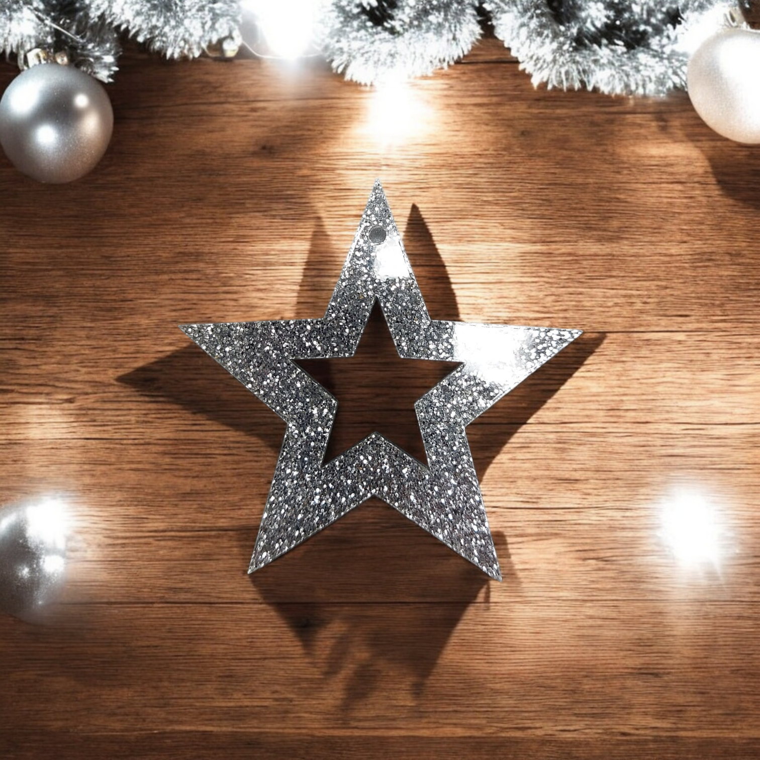 Piękna ozdoba choinki. Gwiazdka wykonana z brokatowego akrylu. Posiada dziurkę na sznureczek.