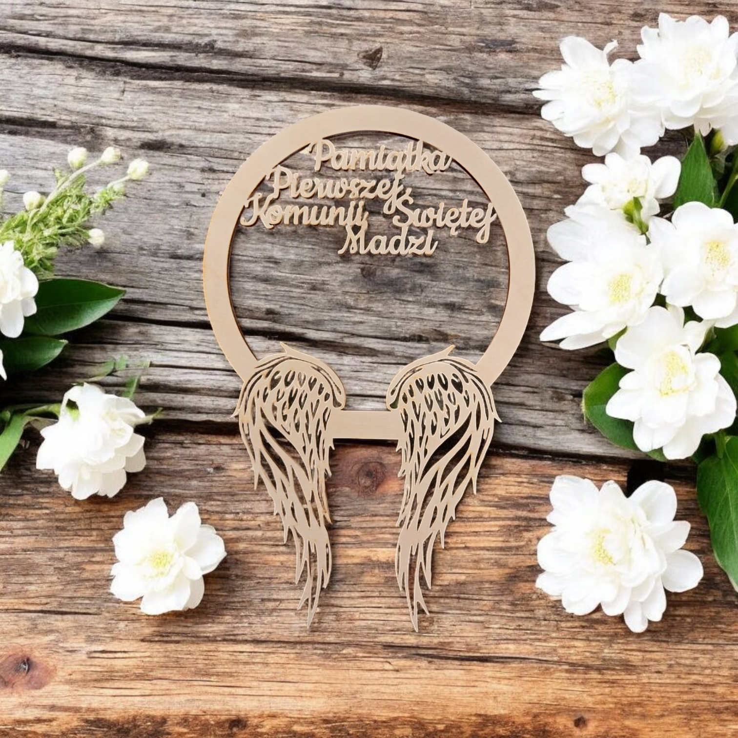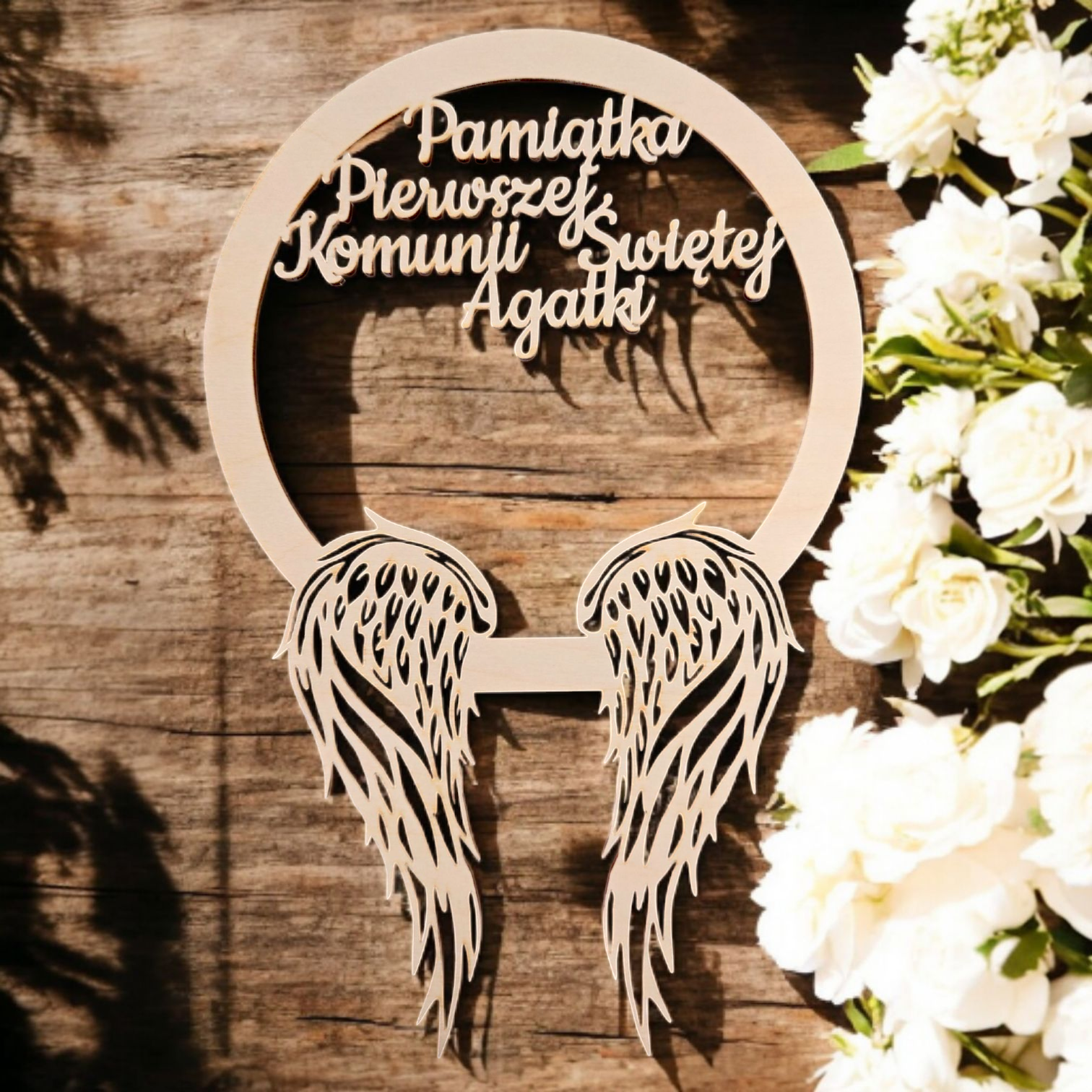 Obręcz ze sklejki ze skrzydełkami Komunia Święta personalizowany 17cm