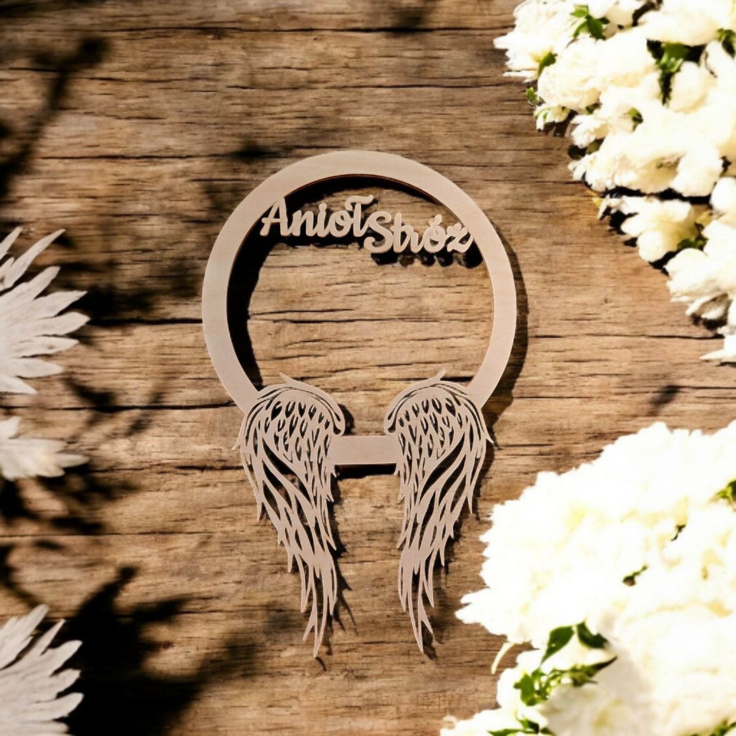 Okrąg ze skrzydłami i napisem "Anioł Stróż" – dekoracja ze sklejki