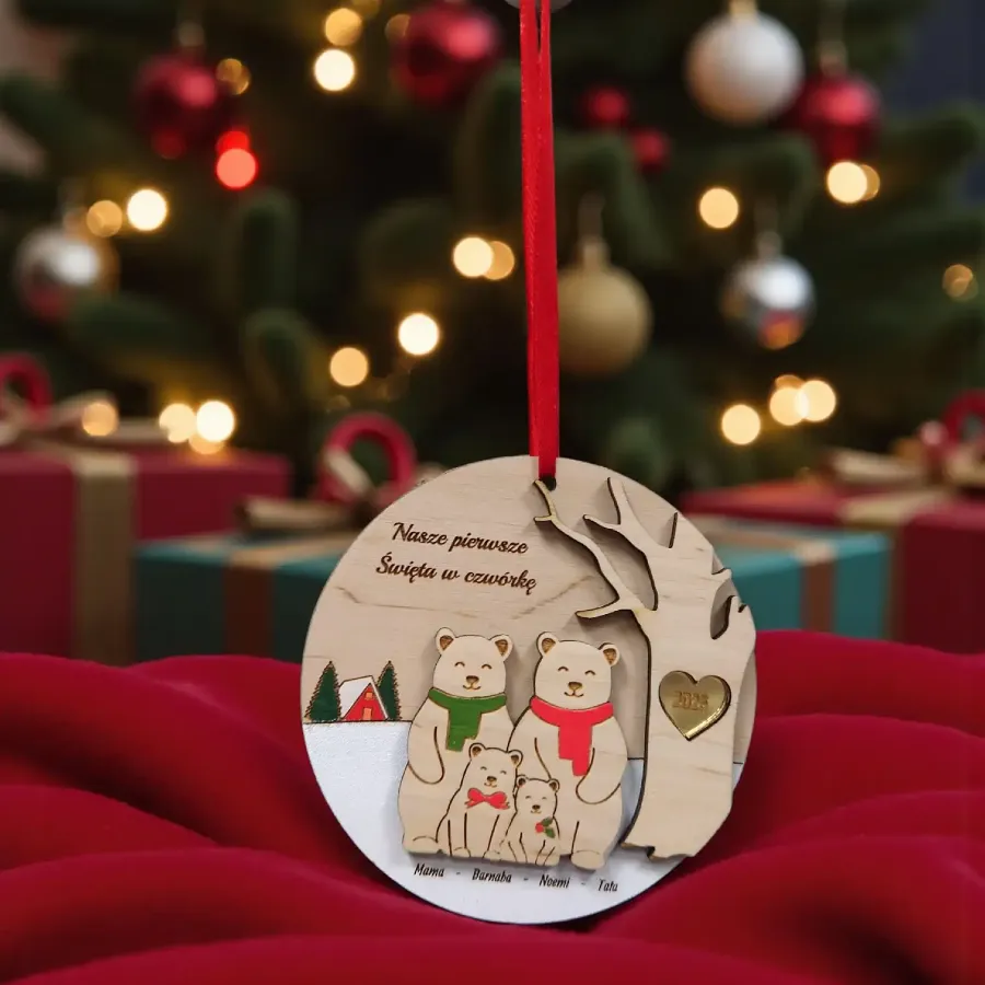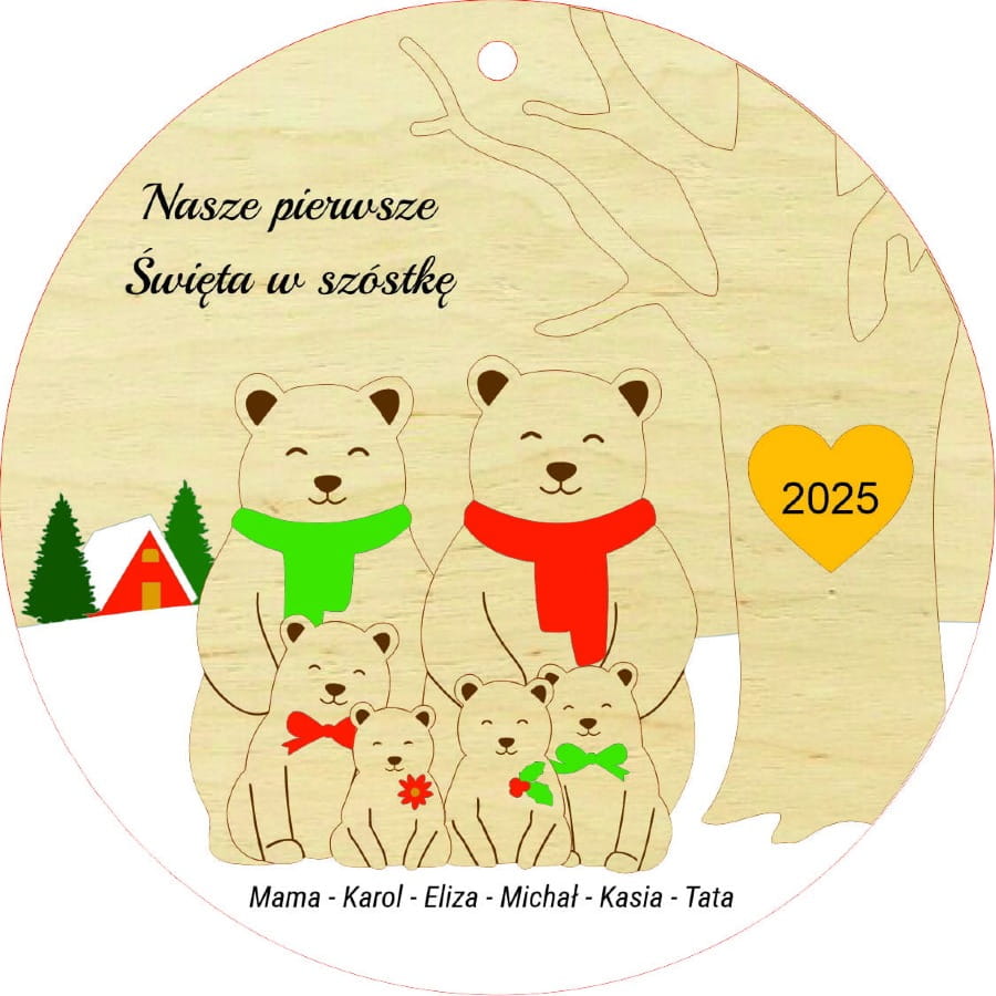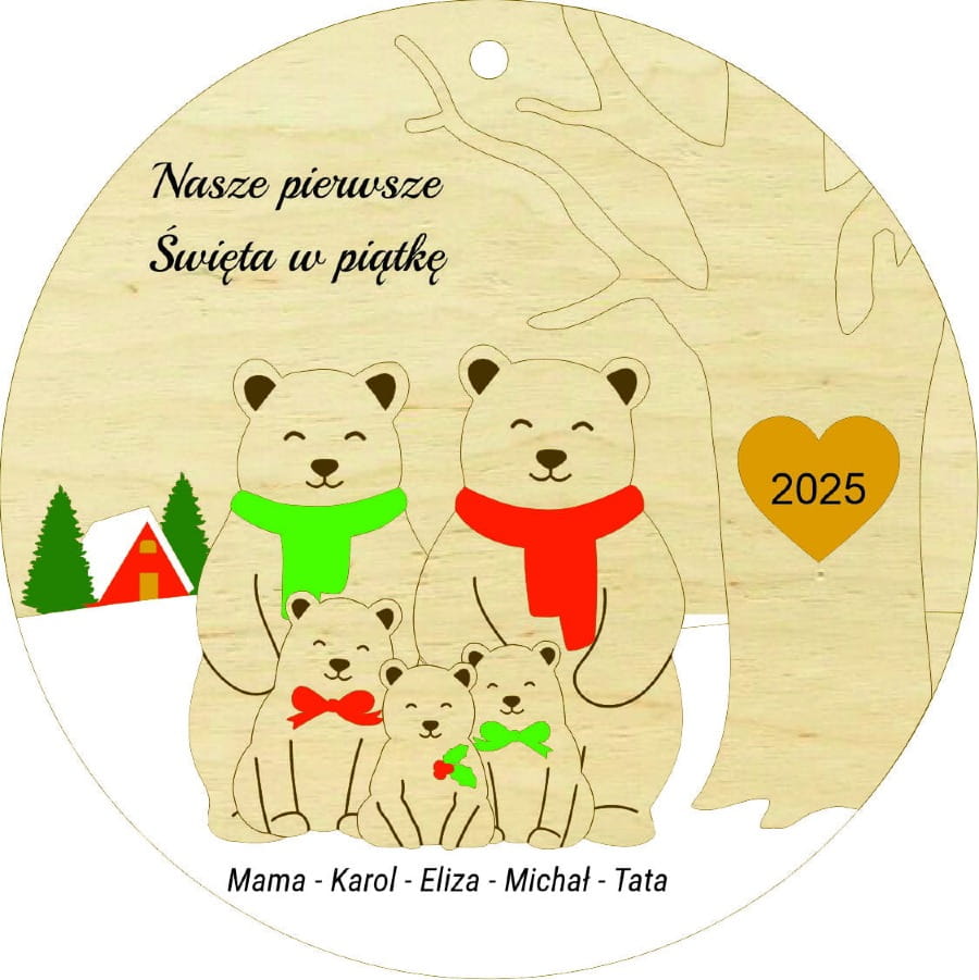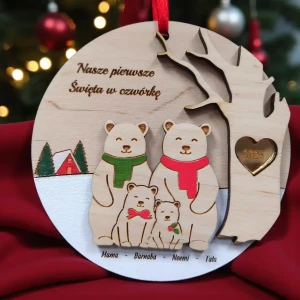 Personalizowana bombka drewniana „Nasze pierwsze Święta ” – rodzina misiów (różne warianty)
