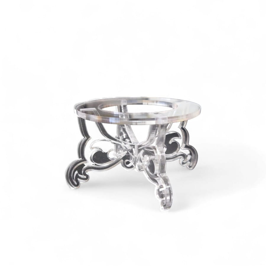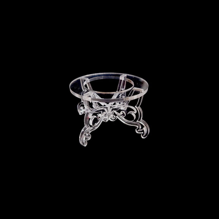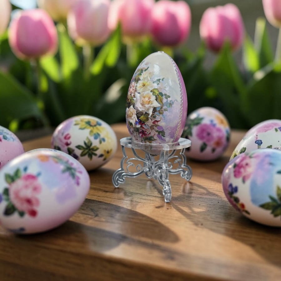 Ażurowe, finezyjnie wycięte nóżki o delikatnie zawijanych kształtach nadają mu elegancki, lekko pałacowy charakter. Okrągła podstawka stabilnie podtrzymuje jajko, a transparentny materiał sprawia, że cała uwaga skupia się na dekoracji. Stojak nie przytłacza – podkreśla to, co najpiękniejsze.