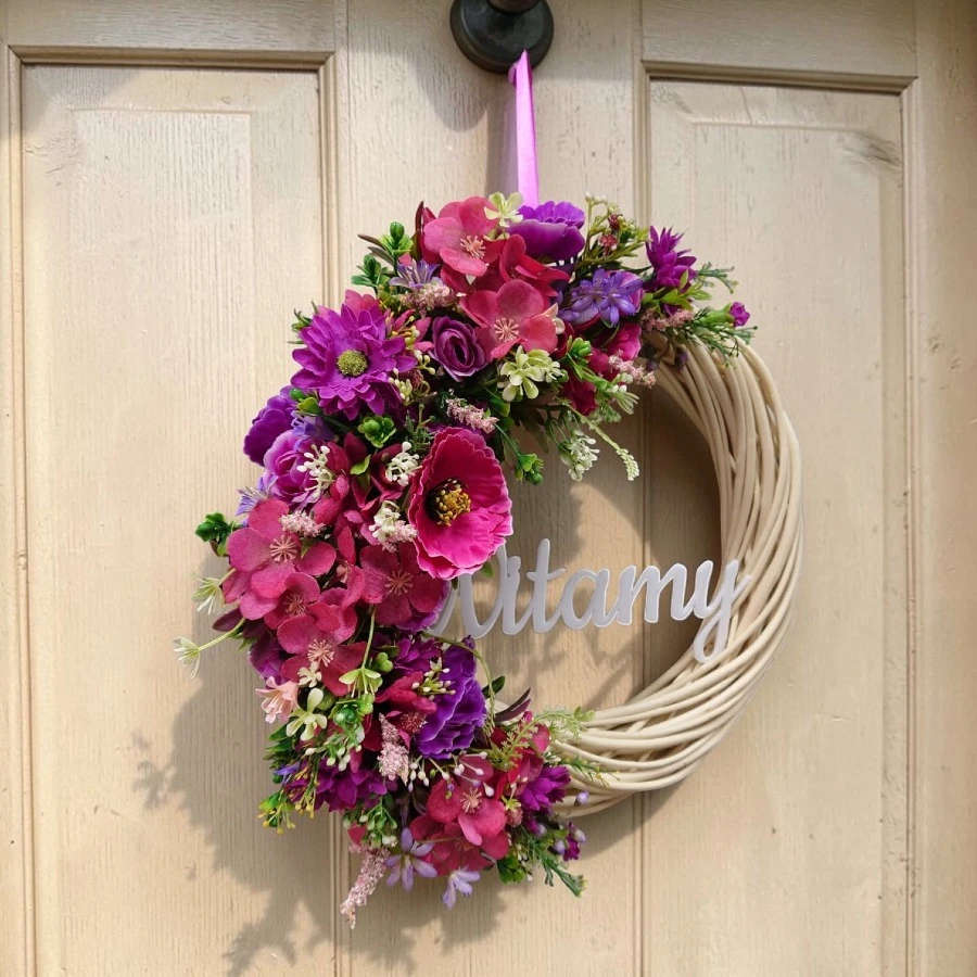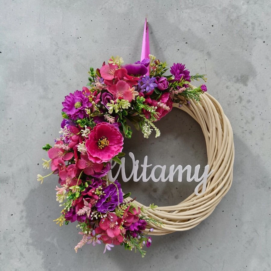 Lewą część wianka zdobi bogata kompozycja kwiatów w odcieniach intensywnego różu, fuksji i fioletu, przełamanych drobnymi akcentami zieleni. Wśród nich wyróżniają się większe kwiaty o wyrazistych płatkach oraz drobniejsze, subtelne dodatki, które nadają aranżacji głębi i naturalności. Centralnie umieszczony napis „Witamy” wykonany jest z białego akrylu o grubości 3 mm – elegancki, lekki i czytelny.