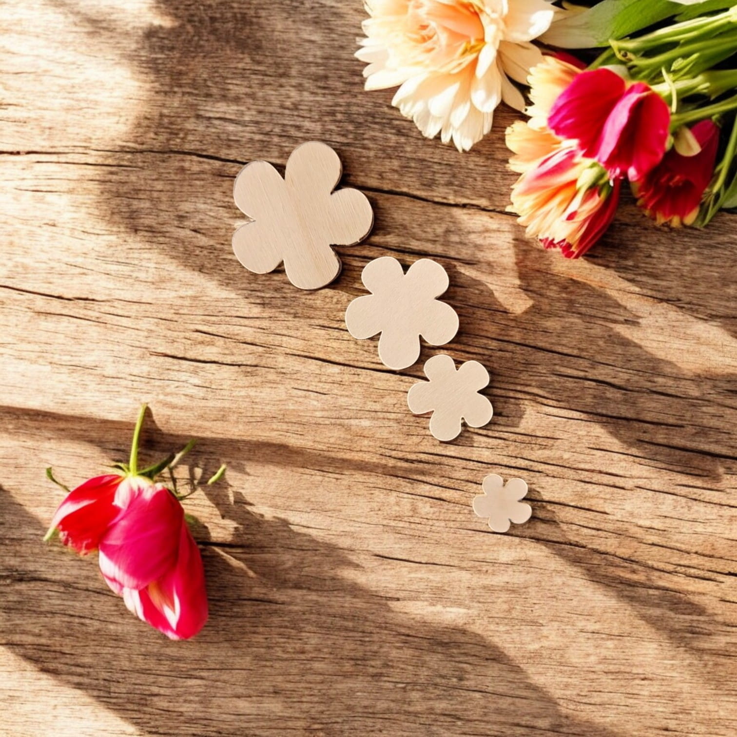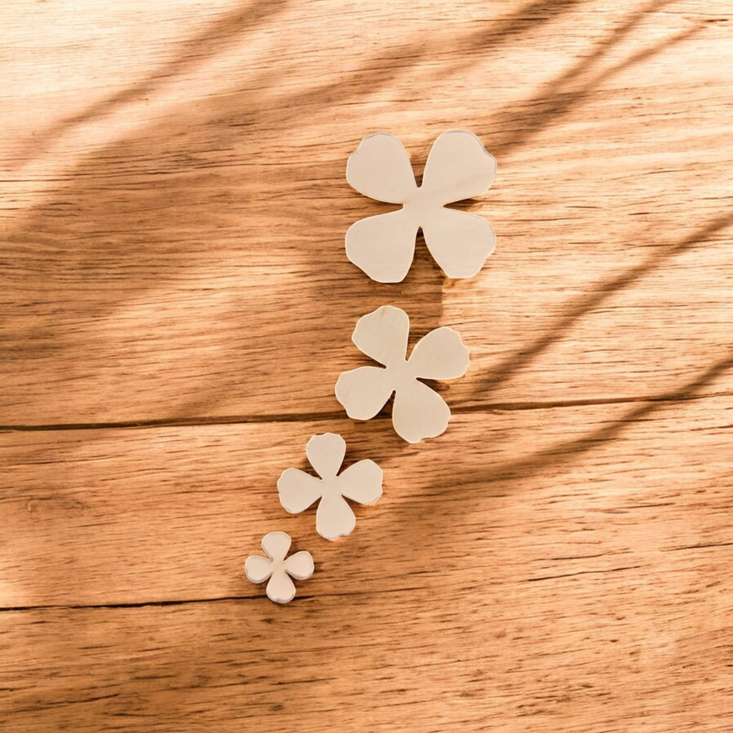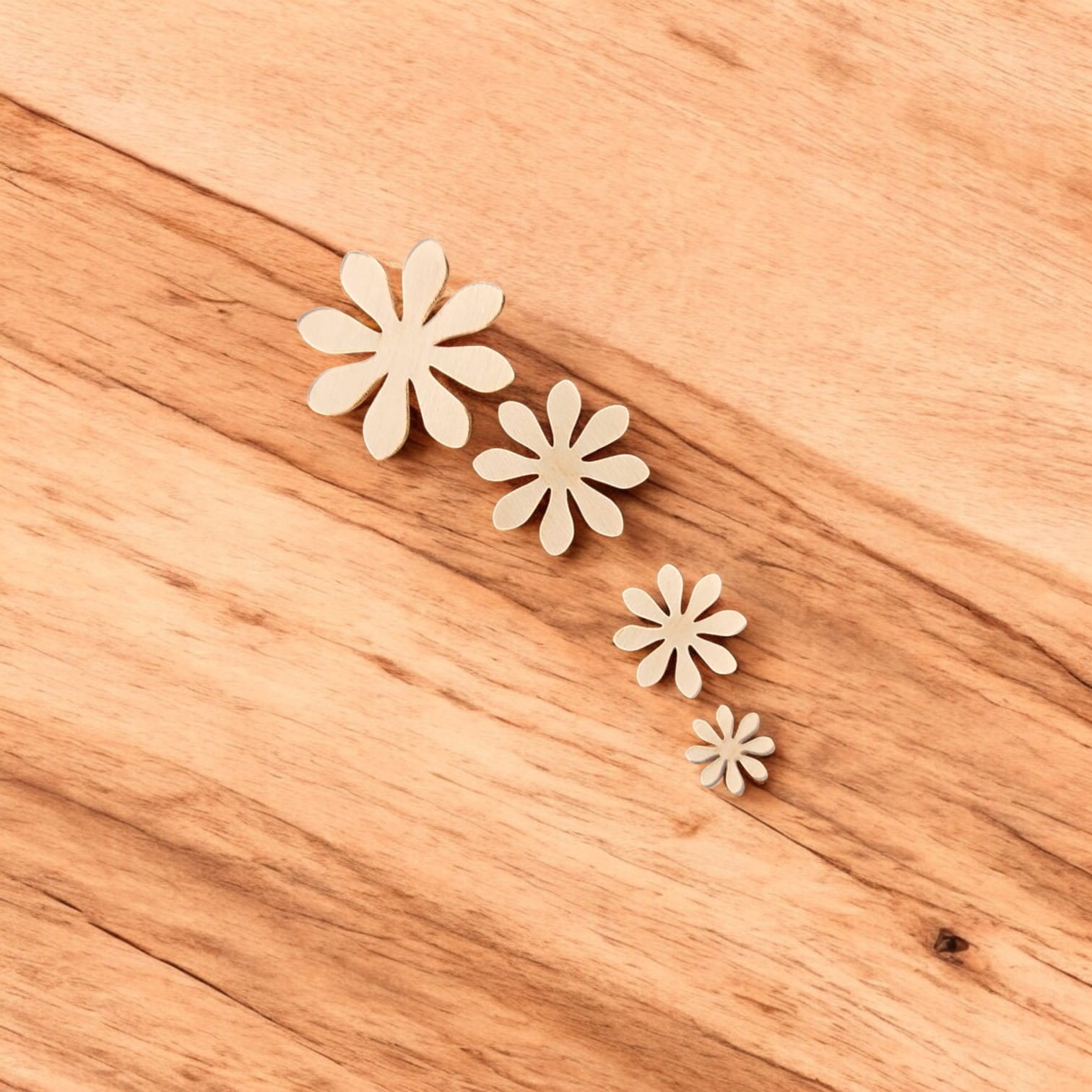 Uroczy zestaw drewnianych kwiatków wyciętych laserowo ze sklejki brzozowej to idealny dodatek do rękodzieła i dekoracji. Dzięki różnym rozmiarom (1 cm, 1,5 cm, 2 cm, 2,5 cm) świetnie sprawdzą się w wielu projektach artystycznych.
